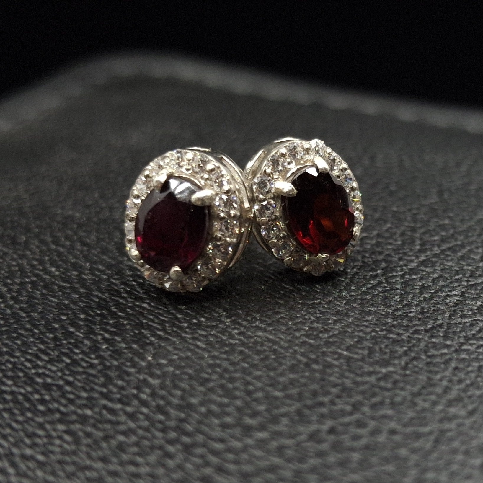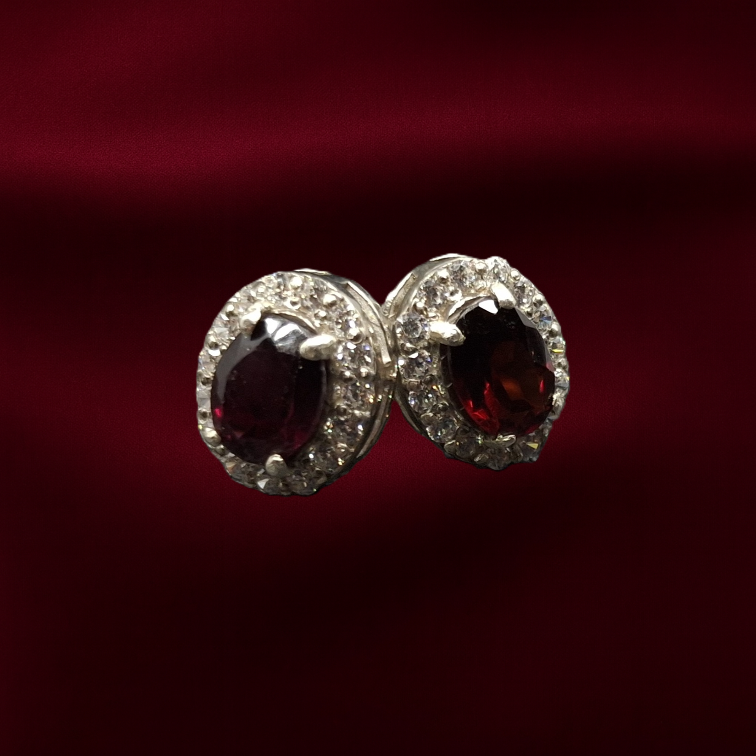 Indulge in timeless elegance with this striking pair of African ruby stud earrings, expertly set in 925 sterling silver. These richly hued rubies are framed by a glittering halo of meticulously set clear cubic zirconia stones, enhancing their brilliance. Whether you're dressing for a formal evening or elevating your daily style, these earrings add a classic yet bold statement to any ensemble.
