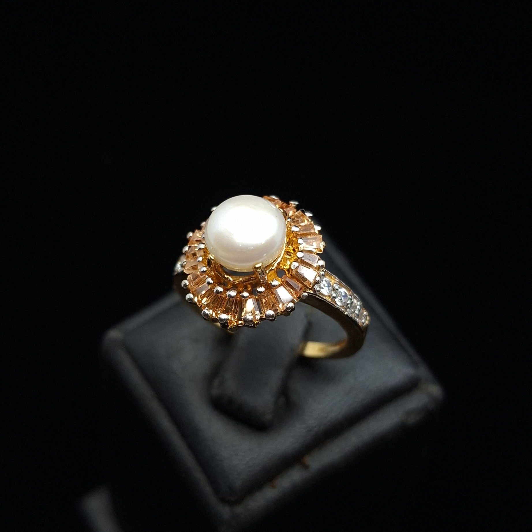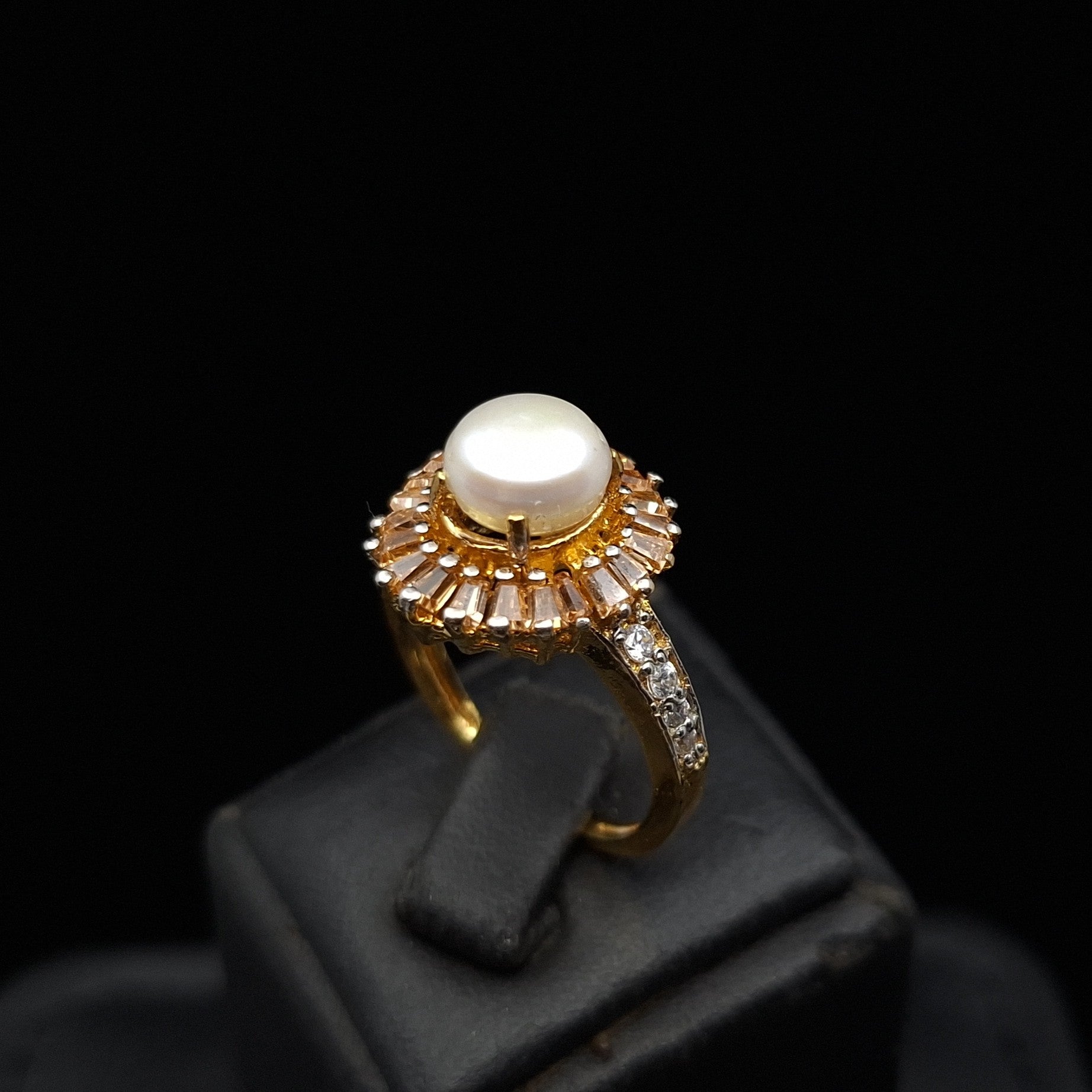 A timeless statement piece featuring a radiant freshwater pearl set in gold-plated sterling silver, encircled by a sunburst halo of champagne baguette-cut zirconia. Additional white cubic zirconia accents along the band enhance its brilliance. Elegant and feminine, perfect for formal occasions or everyday luxury.