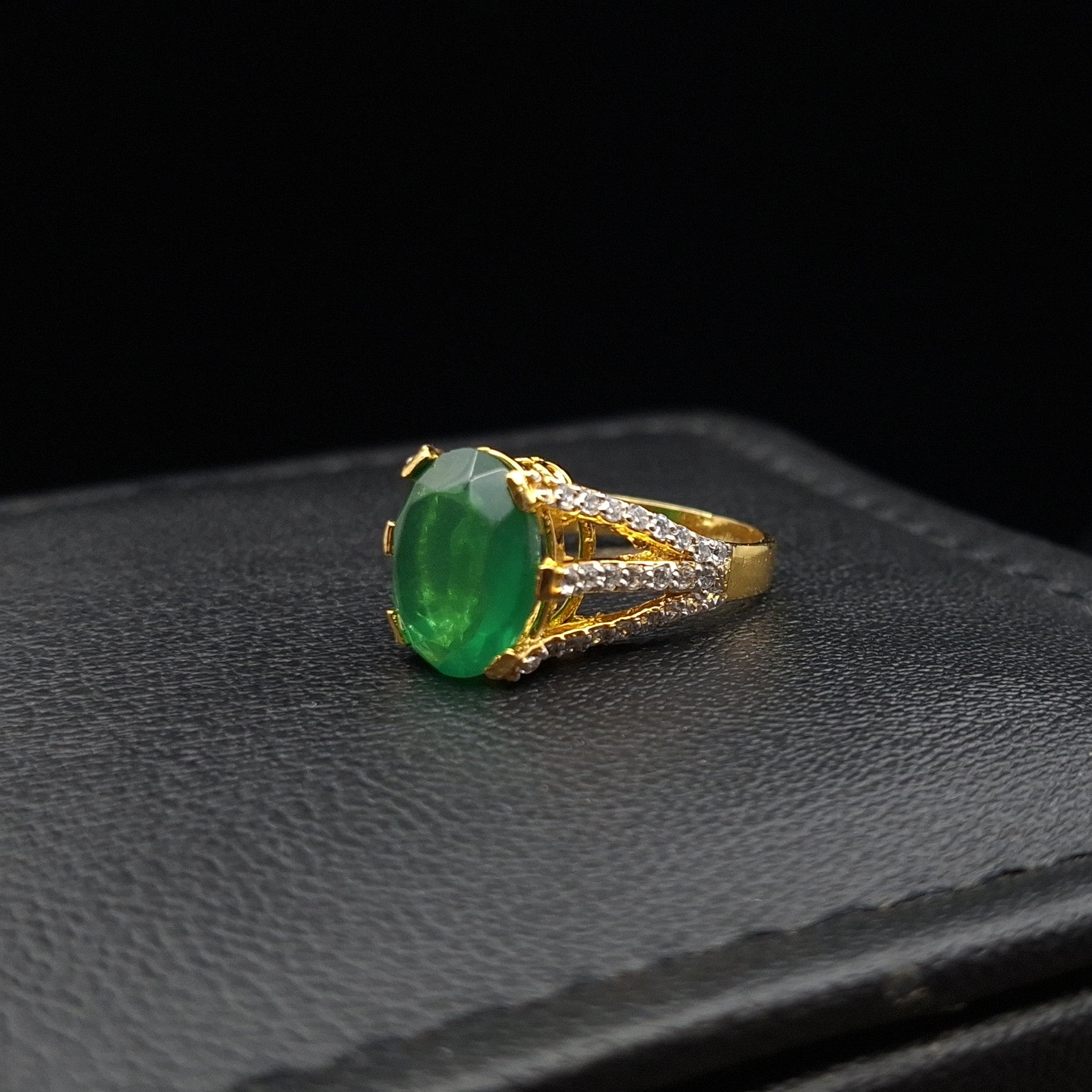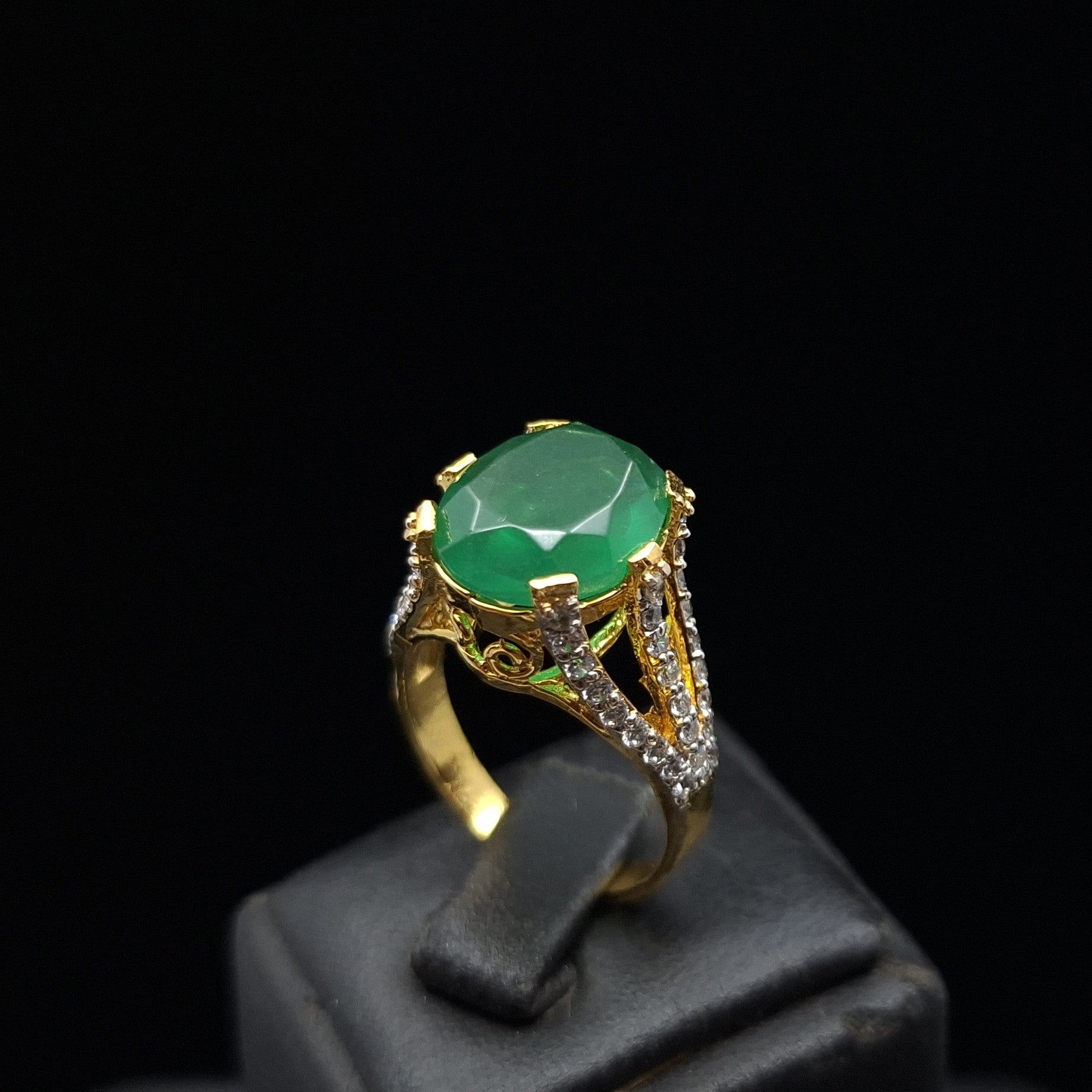 Make a bold statement with this striking green onyx ring, crafted in gold-plated sterling silver. The oval-cut green onyx takes center stage, its deep, vibrant hue beautifully contrasted by shimmering cubic zirconia accents. The split shank design adds elegance and detail, making it a perfect piece for both formal occasions and everyday sophistication.