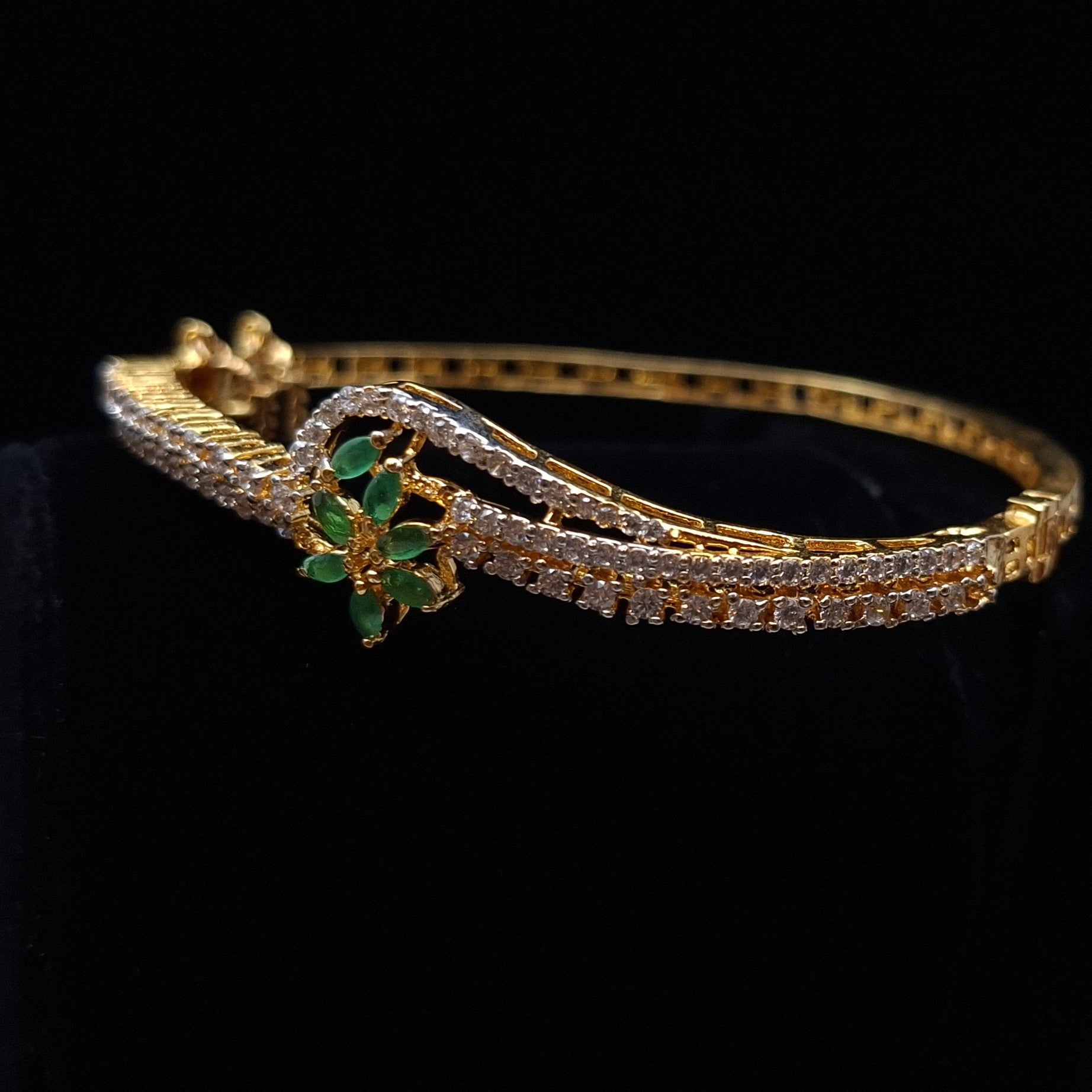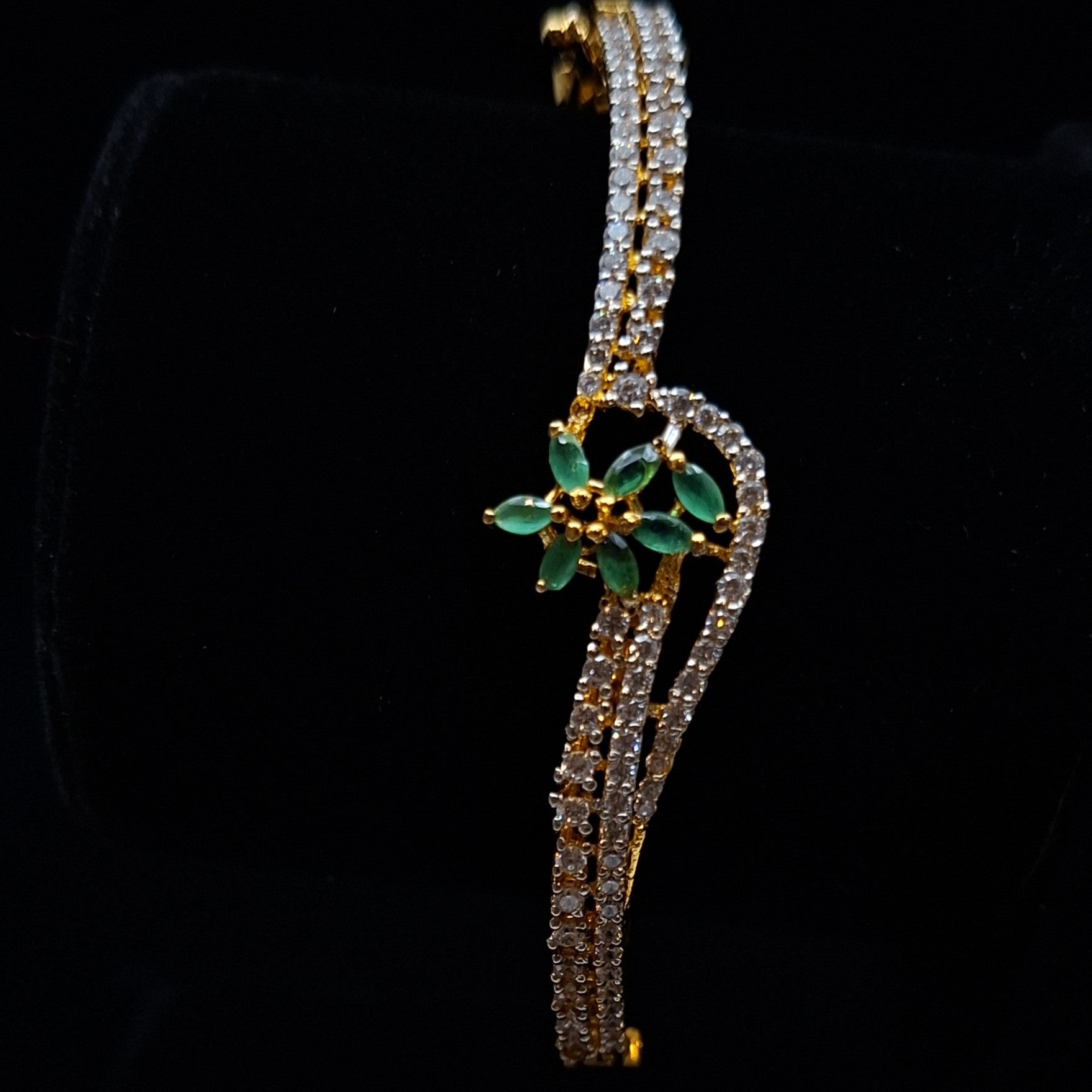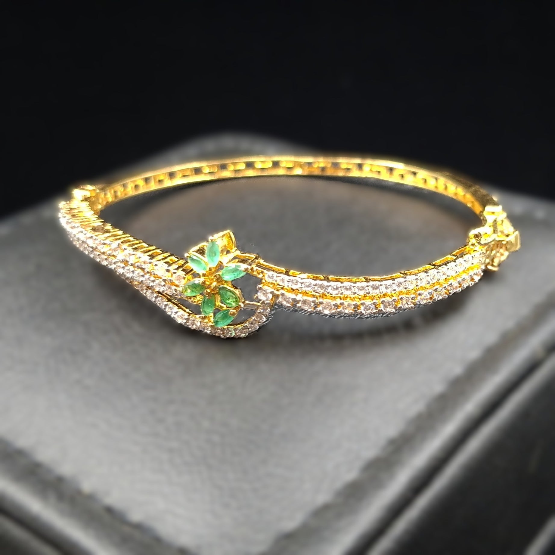 Graceful and radiant, this bangle is crafted in gold-plated 925 sterling silver and adorned with shimmering pave-set cubic zirconia. At its heart, a delicate floral motif blooms with green petal-shaped stones, bringing a vibrant touch of nature-inspired elegance. A perfect balance of sparkle and sophistication, this piece is ideal for both festive and everyday wear.