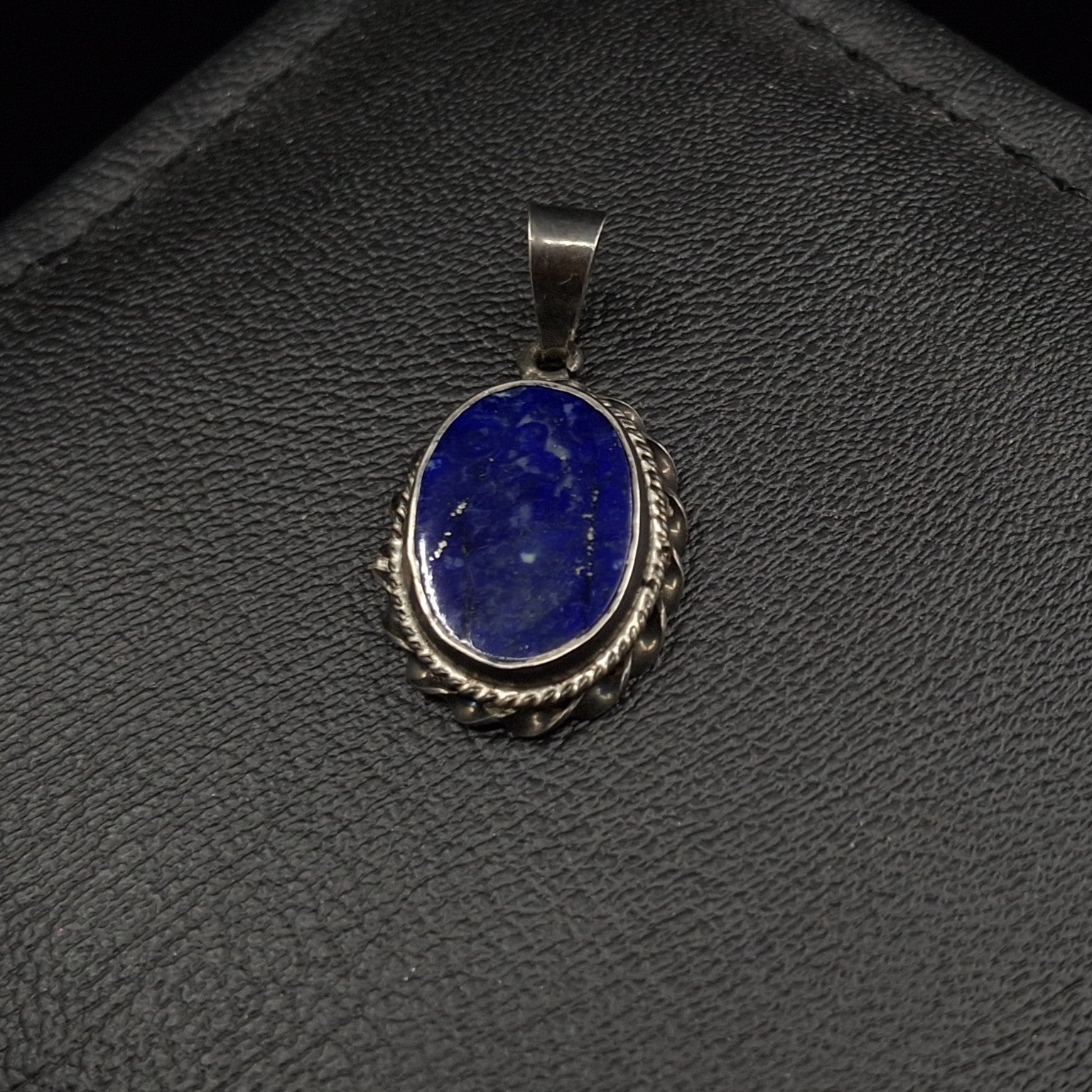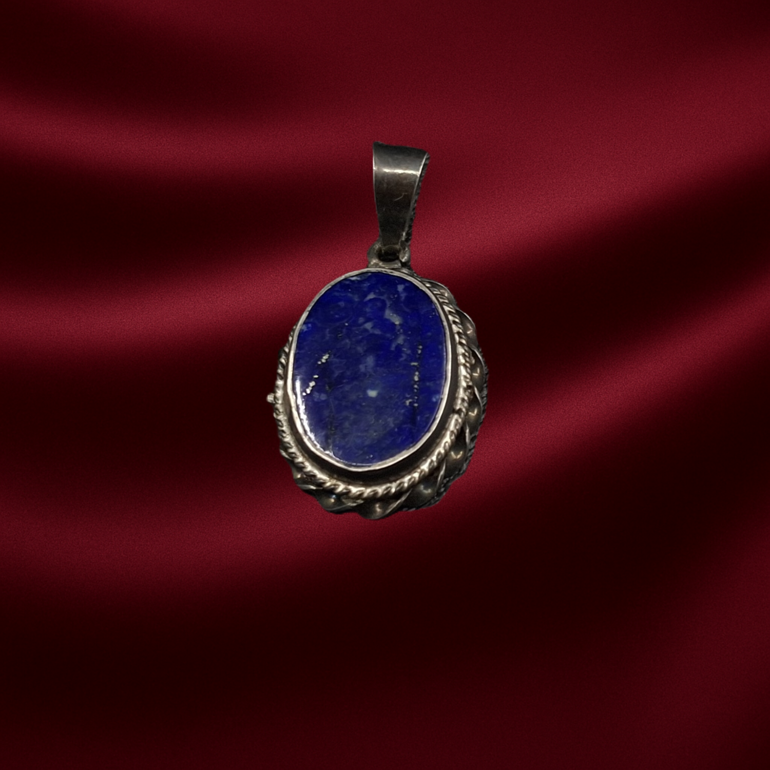 Elevate your jewelry collection with the deep celestial beauty of this handcrafted pendant featuring a natural Lapis Lazuli cabochon. Set in a detailed 925 sterling silver frame with twisted rope accents, this piece draws inspiration from timeless artisan craftsmanship. The gemstone displays a rich royal blue hue interspersed with golden pyrite flecks, reminiscent of a starlit night sky.