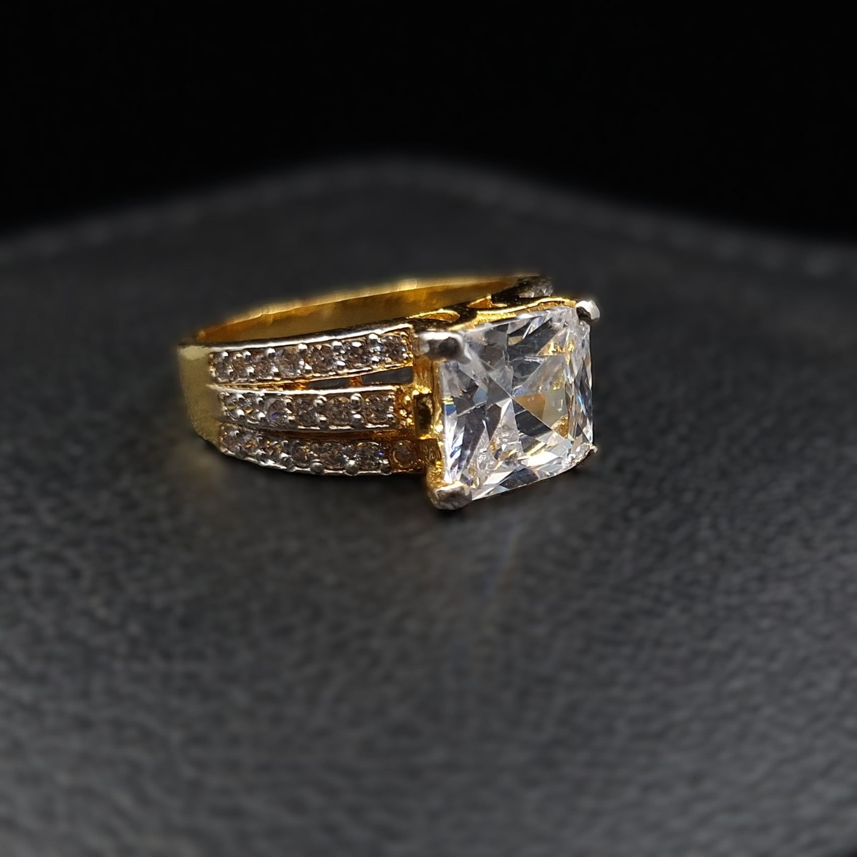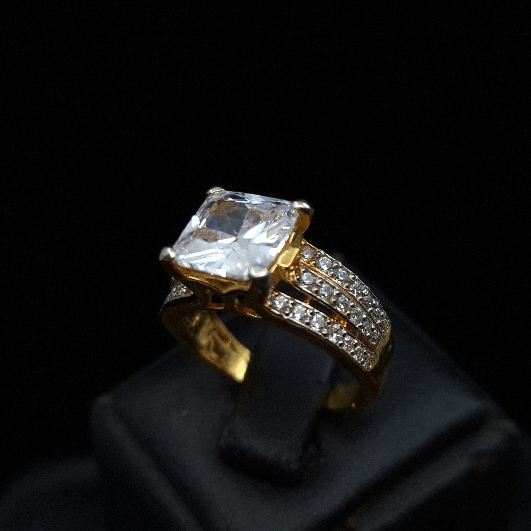 The centerpiece features a dazzling princess-cut cubic zirconia, expertly set in four prongs that elevate its sparkle. The band is intricately split into three rows, each encrusted with pavé-set cubic zirconia stones. Crafted in gold-plated 925 sterling silver, this piece offers a luxurious finish and lasting shine.