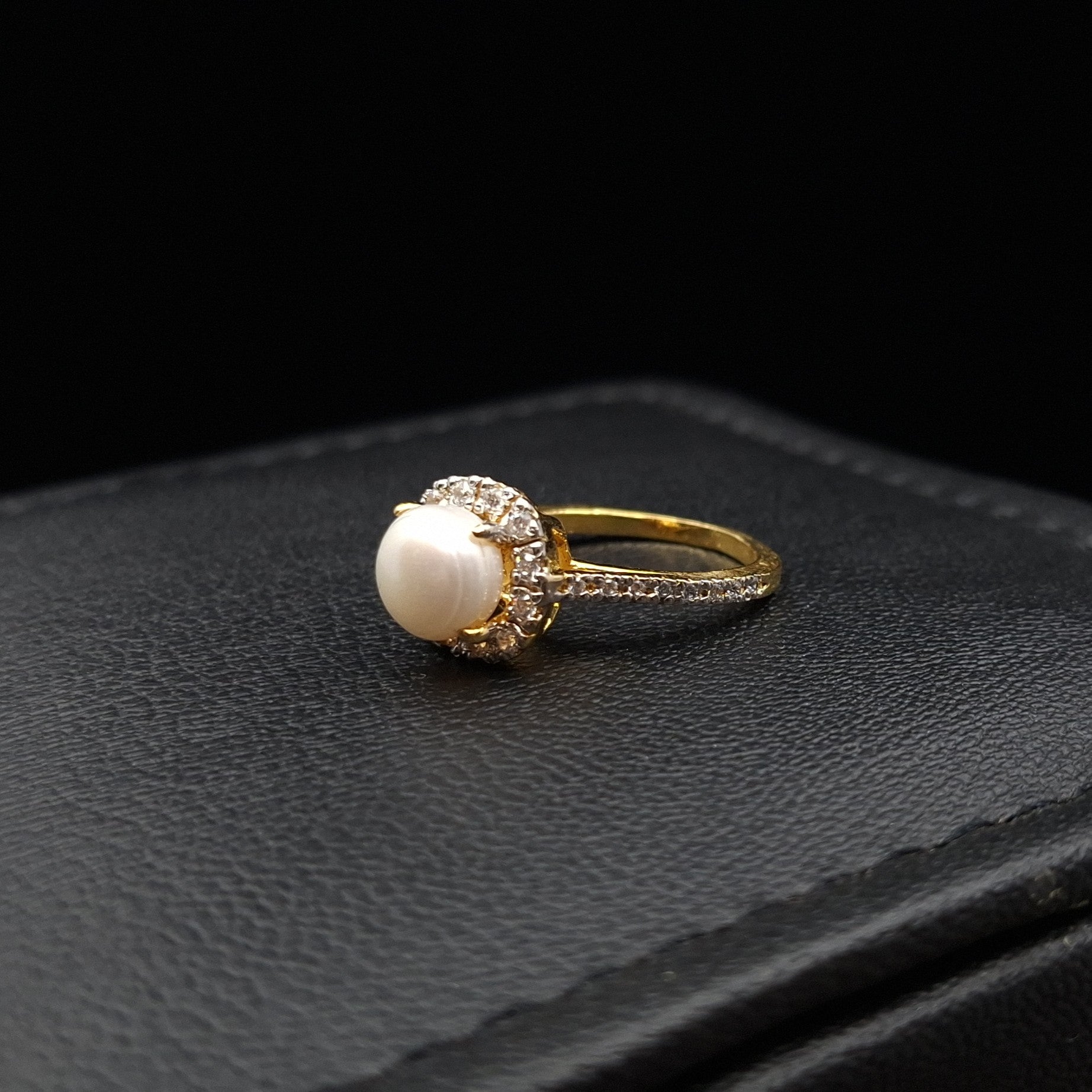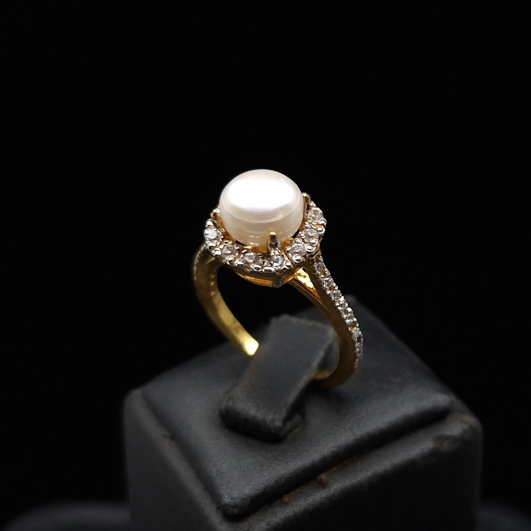 This elegant Pearl Halo Ring combines timeless beauty with modern sophistication. Featuring a luminous freshwater pearl at its center, the ring is framed by a halo of sparkling cubic zirconia accents. Crafted in gold-plated sterling silver, the split shank is also adorned with zirconia, adding brilliance and balance. A perfect blend of classic grace and contemporary design.