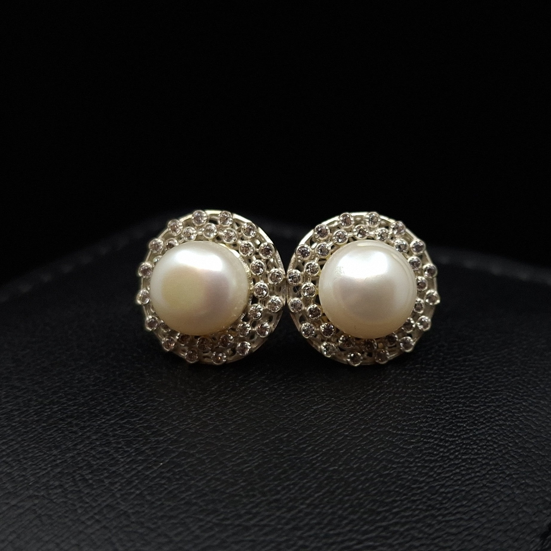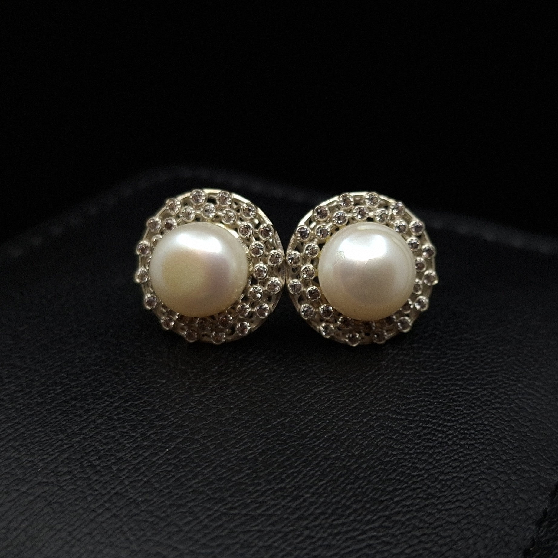 Radiating classic sophistication, these freshwater pearl stud earrings are a graceful addition to any collection. The lustrous pearls are nestled in a sparkling halo of high-clarity cubic zirconia, all elegantly set in 925 sterling silver. Their timeless floral-inspired design makes them perfect for weddings, formal occasions, or simply elevating your everyday style.