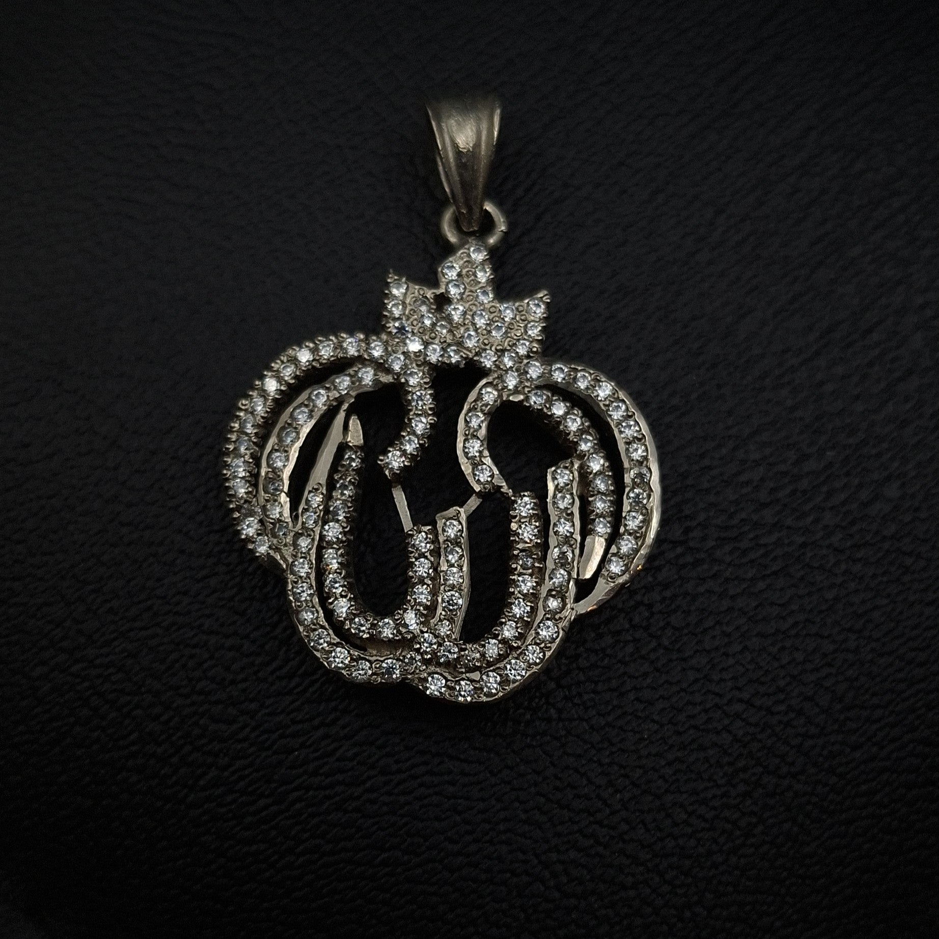 Han-crafted expertly set Allah pendant in Brilliant Cubic Zirconia on 925 Sterling Silver. This immaculate pendant is a shining admission of divine love.