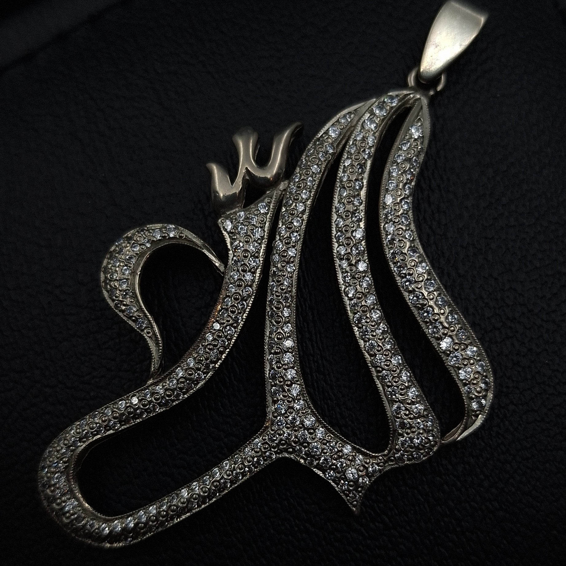 Han-crafted expertly set Allah pendant in Brilliant Cubic Zirconia on 925 Sterling Silver. This immaculate pendant is a shining admission of divine love.