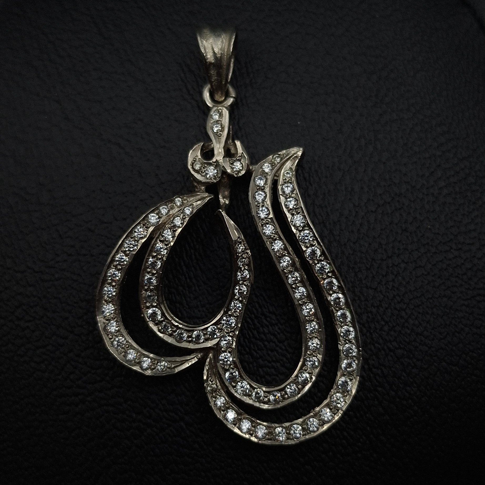 Han-crafted expertly set Allah pendant in Brilliant Cubic Zirconia on 925 Sterling Silver. This immaculate pendant is a shining admission of divine love.
