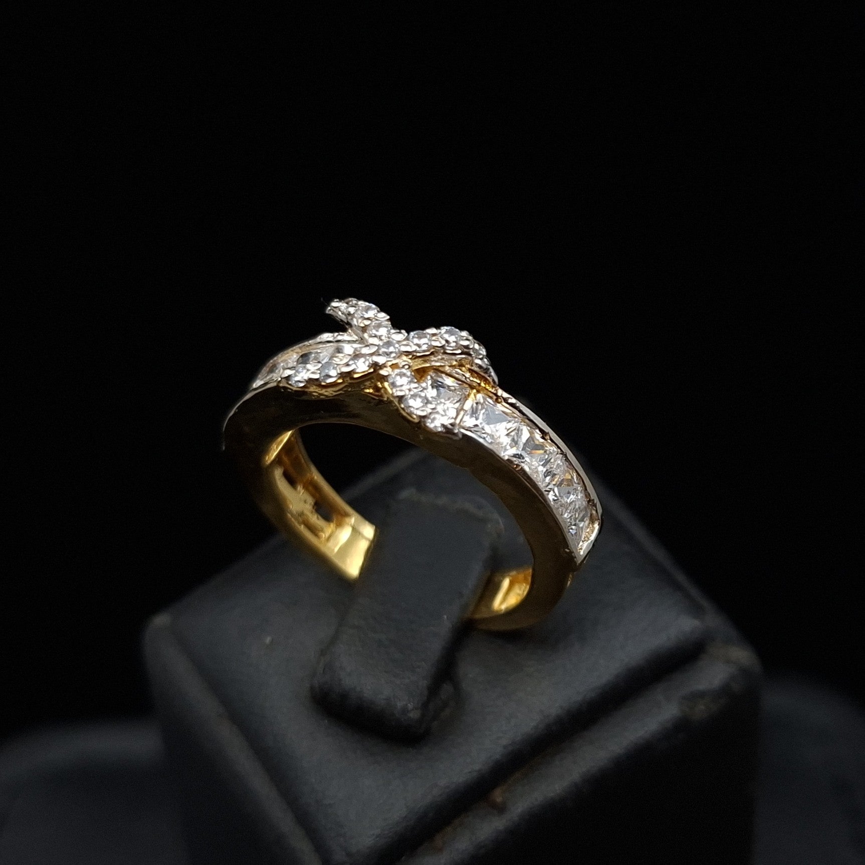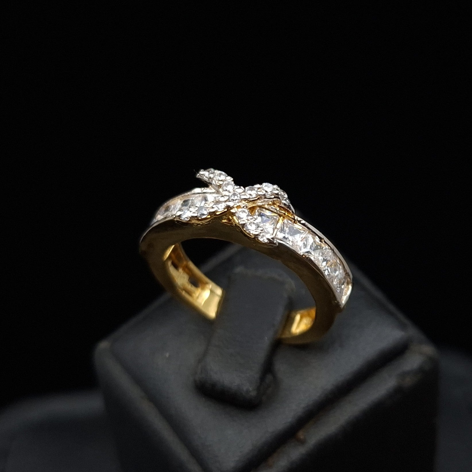 Elegance meets brilliance in this gold-plated 925 sterling silver ring. Featuring channel-set cubic zirconia along the band and a delicate crossover of pavé-set stones, this ring offers timeless charm with a luxurious touch.