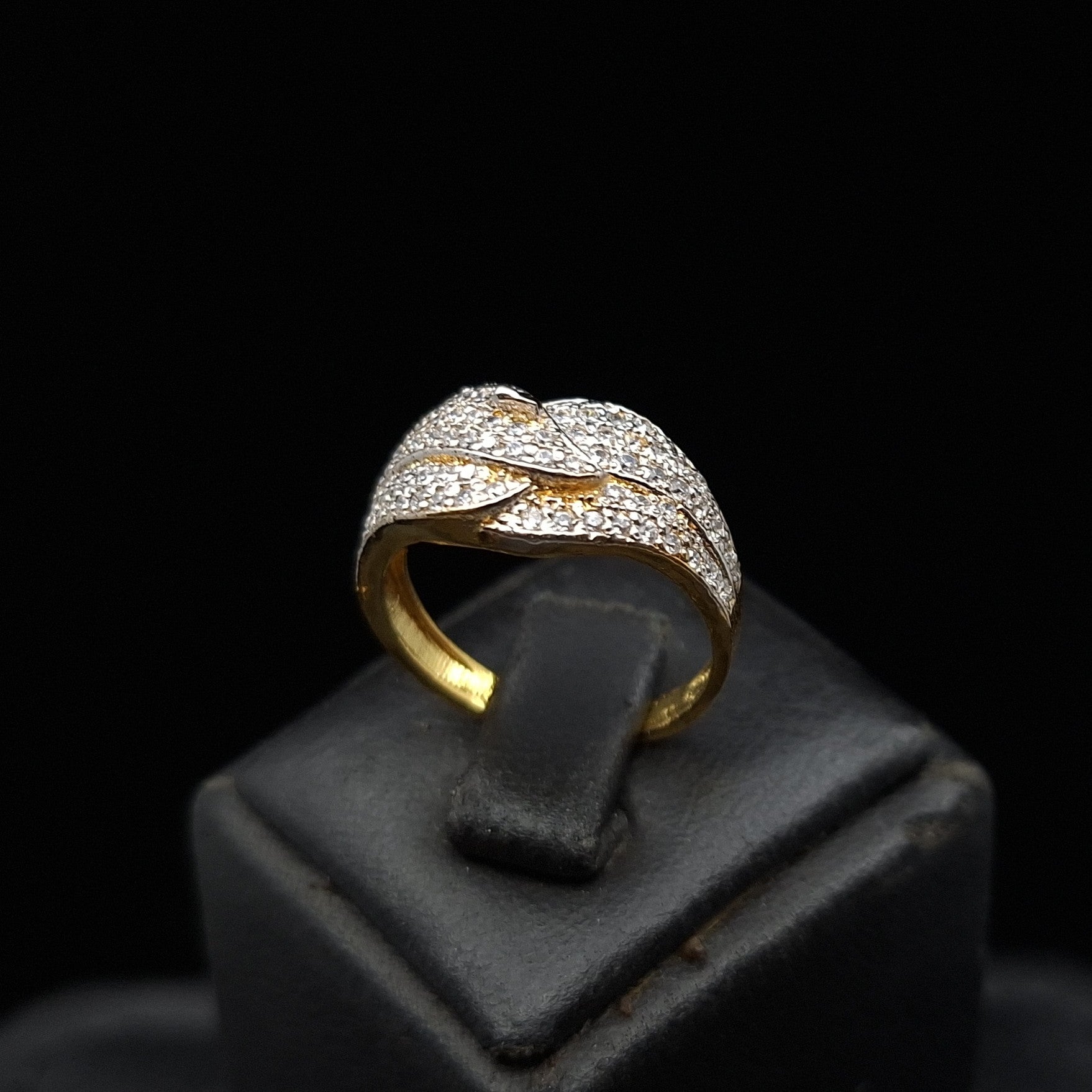 A bold yet graceful piece, this gold-plated 925 silver ring features an elegant criss-cross design, fully paved with dazzling cubic zirconia. The intricate band showcases a leaf-like weave that shimmers from every angle, offering a perfect blend of sophistication and sparkle for any occasion.