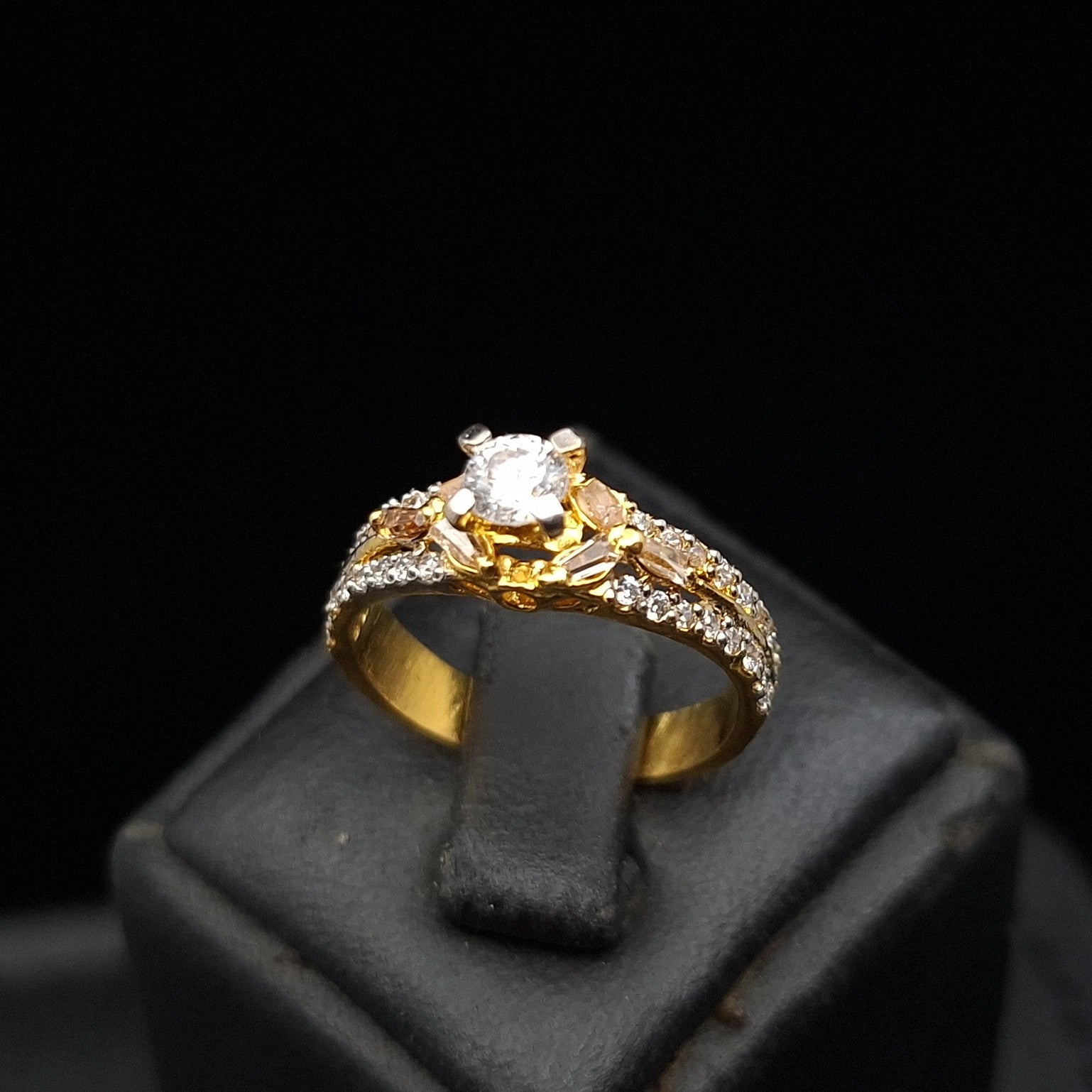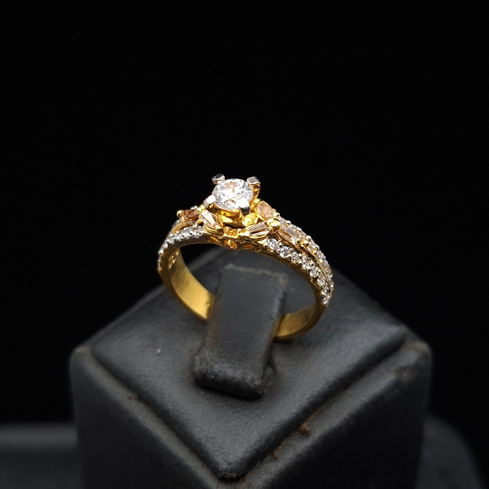 This radiant ring features a brilliant round-cut center cubic zirconia flanked by marquise and round accents, all pave-set on a gold-plated 925 silver band. With intricate sparkle and warm golden tones, this piece captures timeless elegance with a modern touch.