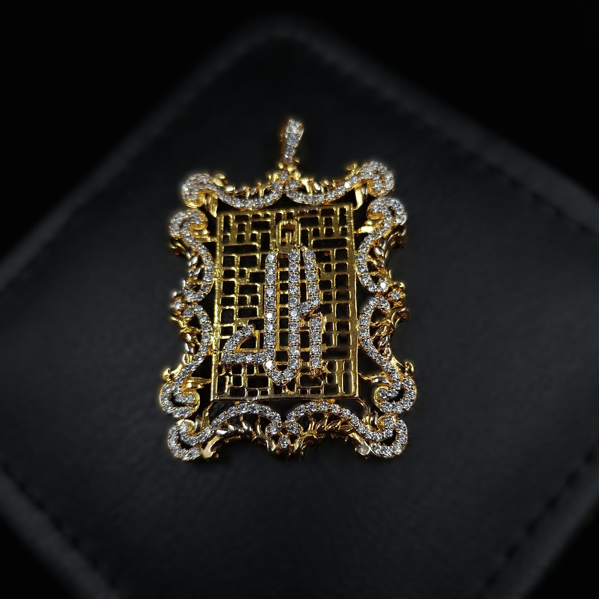 A graceful Allah locket, beautifully crafted in gold-plated 925 sterling silver and adorned with brilliant cubic zirconia. Its ornate rectangular frame highlights the sparkling Arabic calligraphy, making it a meaningful symbol of faith and elegance. Perfect for everyday wear or as a cherished gift.