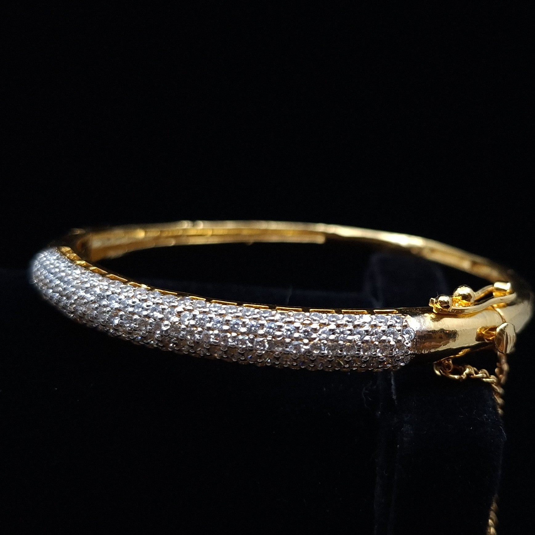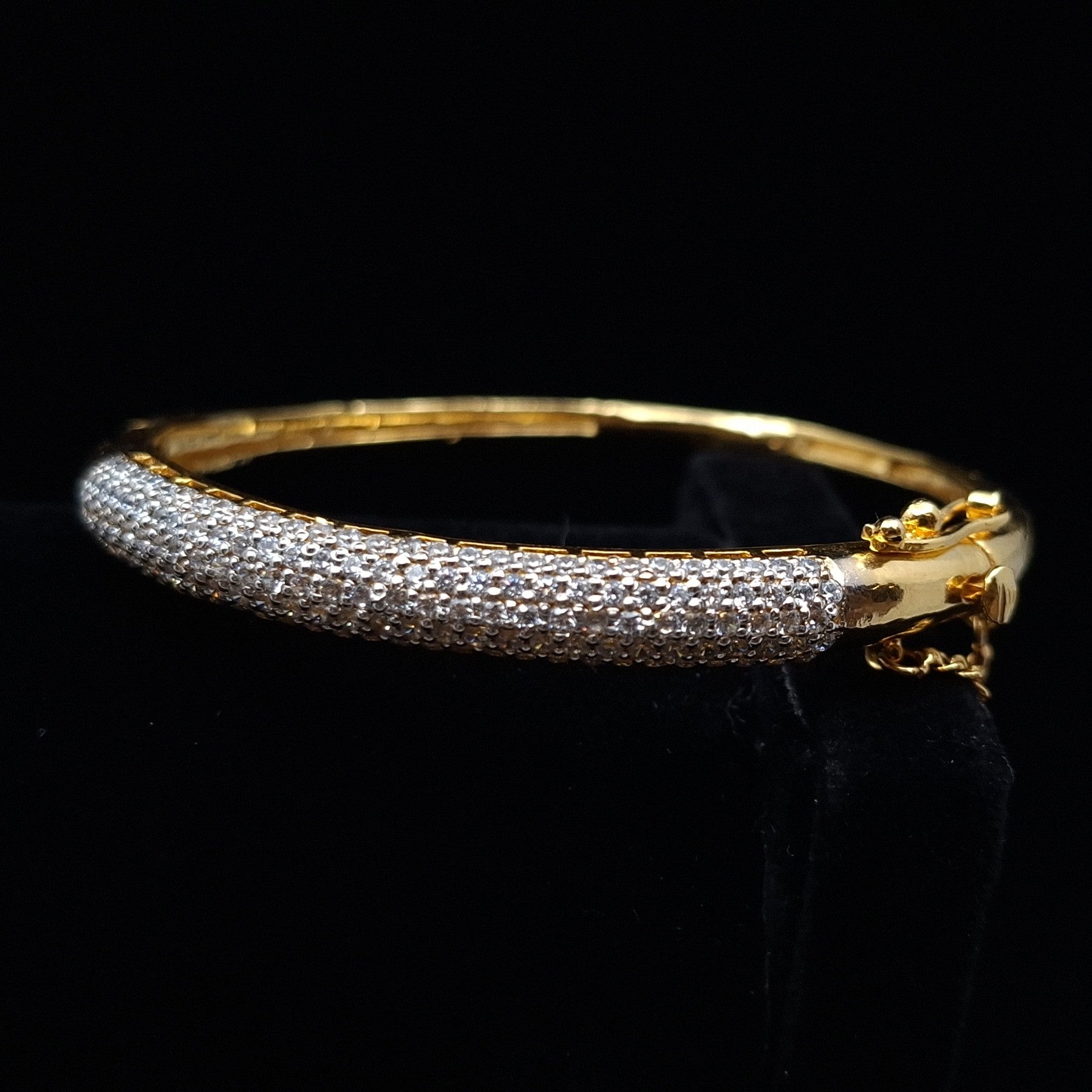 This bracelet is crafted in gold-plated 925 sterling silver and adorned with a full pave of sparkling cubic zirconia. Its sleek, curved silhouette captures light beautifully, while the secure clasp ensures comfort and style for any occasion. A perfect statement of sophistication, it transitions effortlessly from day to evening wear.